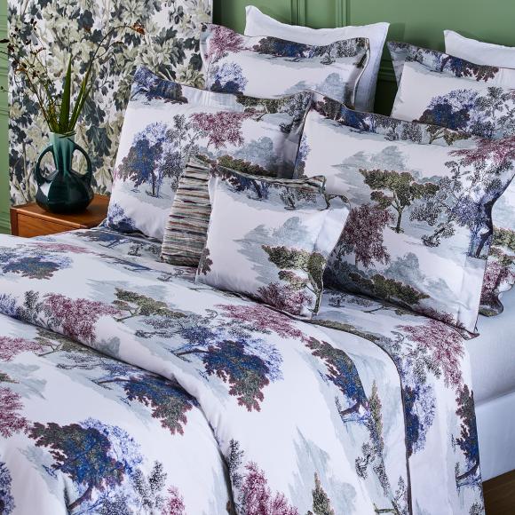 As on a Toile de Jouy, live oak, stone pine and black walnut are ink-drawn and printed on batiste cotton. A model in tune with the times, in chic and vegetal shades.