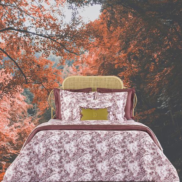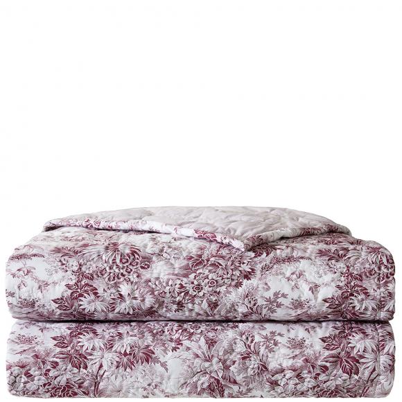 The bed cover features the Toile de Jouy design in Pomegranate and white colours.