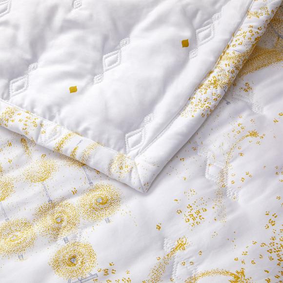 Printed on organic cotton sateen, Royal bases its theme on fireworks display at the Palace of Versailles, evoking the Sun King and sumptuous festivities.