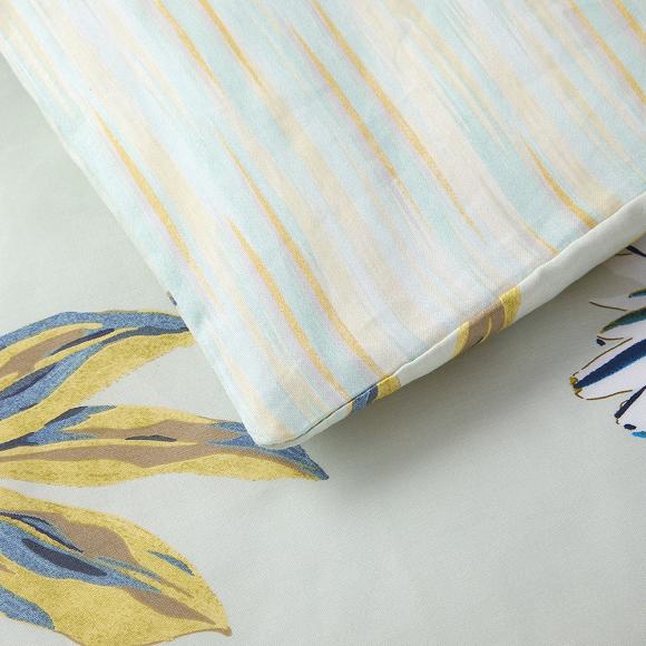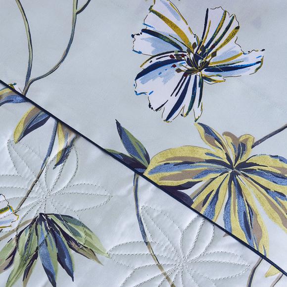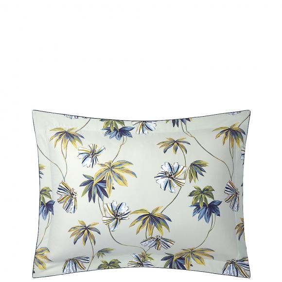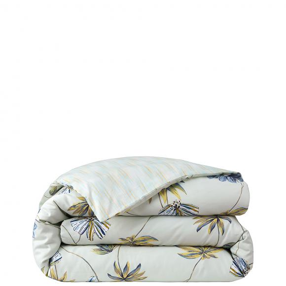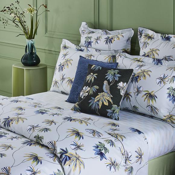 Tropical is a Spring/Summer 2024 release from Yves Delorme. A stunning and impactful design which celebrates exotic vegetation. Taking inspiration in particular from large greenhouses, palms and vines that all grow in tropical temperatures. 100% long staple combed organic cotton sateen is utilised for this beautiful set. The duvet cover and pillowcases are reversible which allows versatility. Accompanying the duvet cover, the pillowcases are also reversible and have a 2" flange and blue braid finish. Watercolour textures are printed on a frosted green cotton sateen.